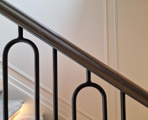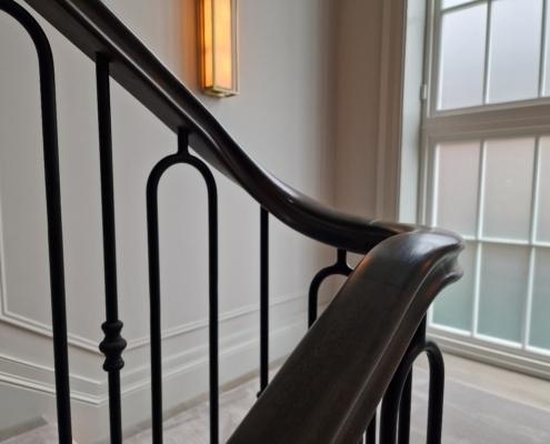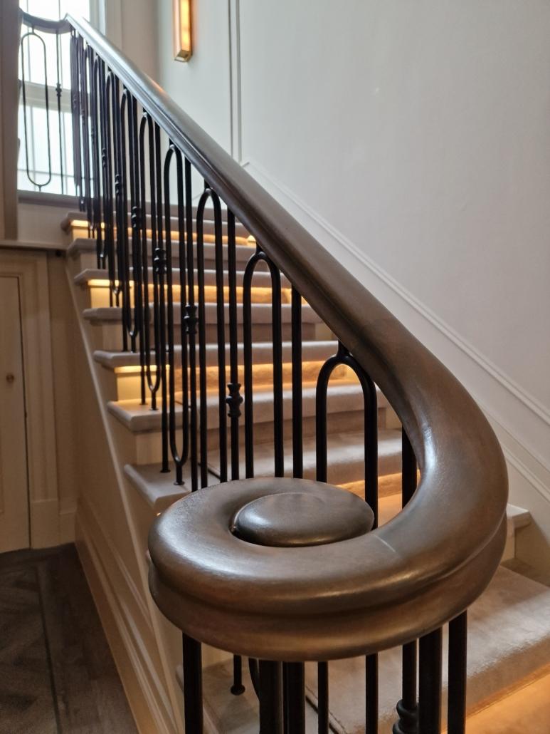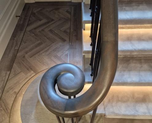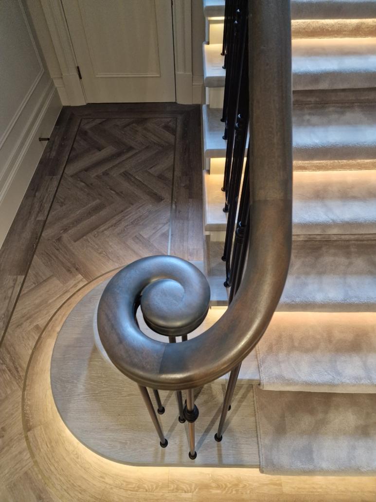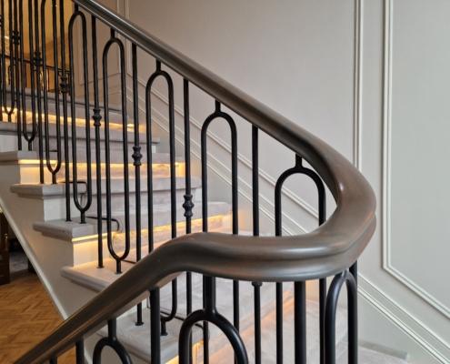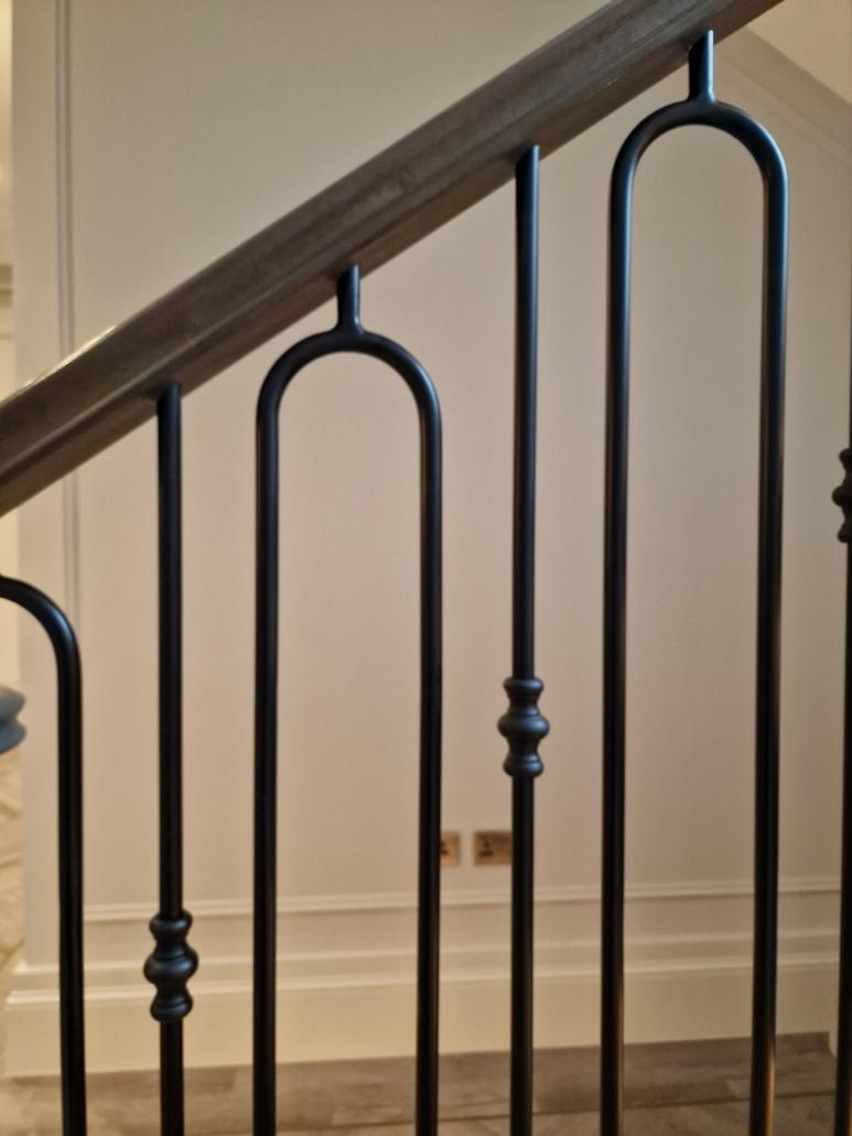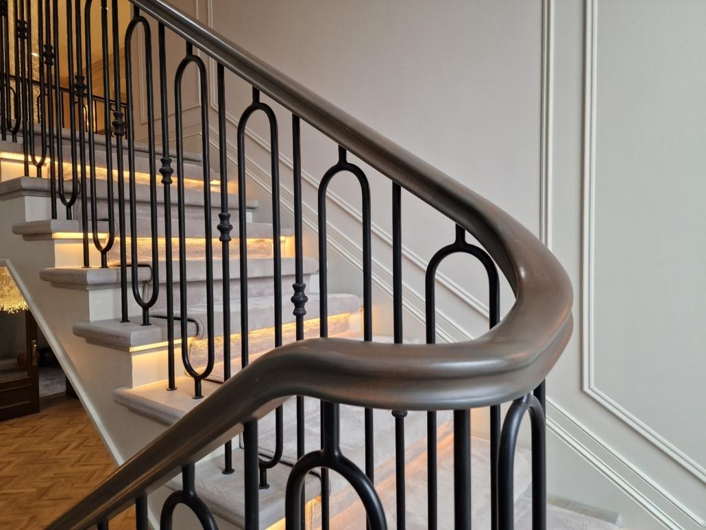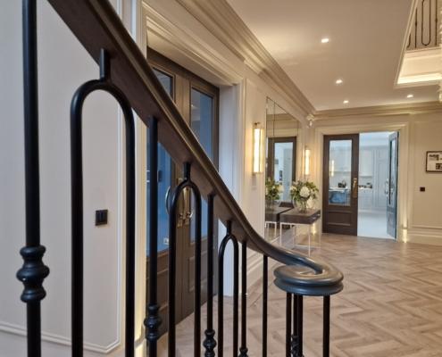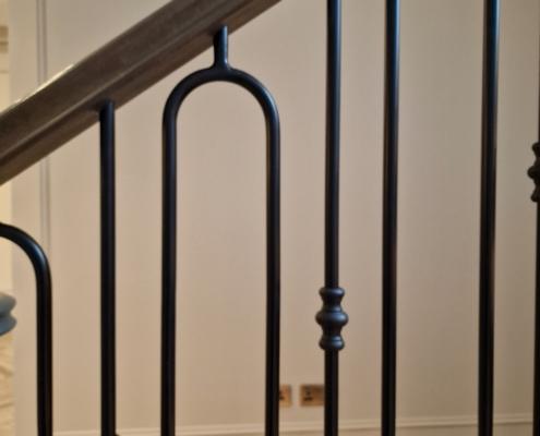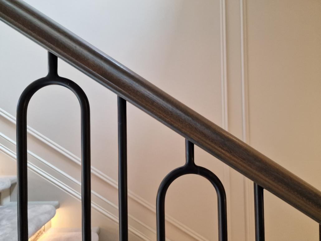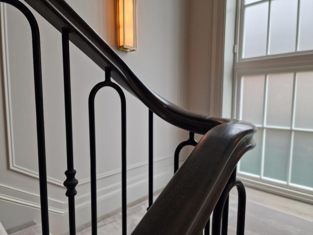 Our bespoke ‘hooped’ spindles – each adorned with hand‑fitted decorative collars – were meticulously hand‑sprayed in‑house to ensure a flawless finish and cohesive look across the entire installation. To complement these spindles, we crafted continuous handrails in sapele, expertly French‑polished to a mirror sheen – the tone and grain bringing warmth and elegance to the overall space.