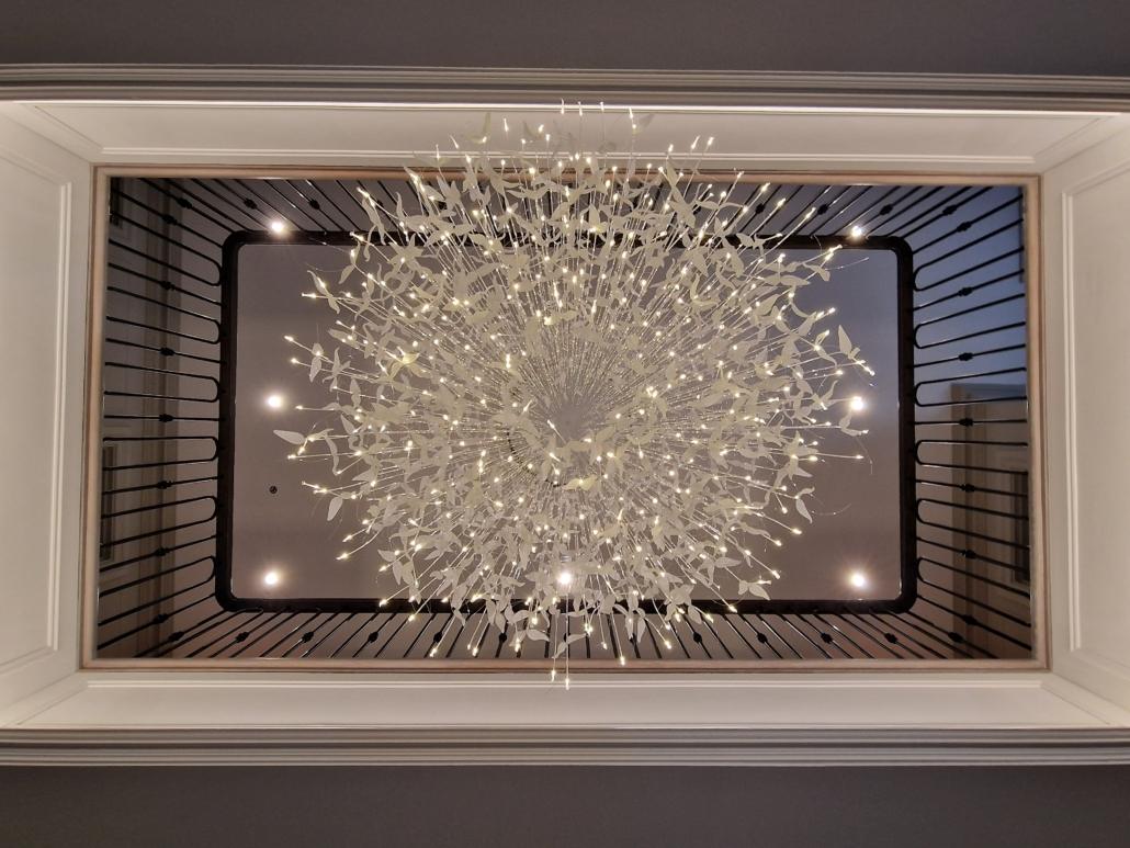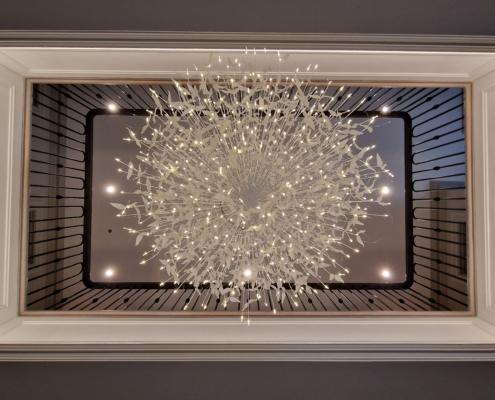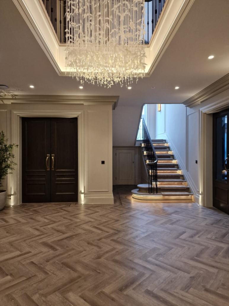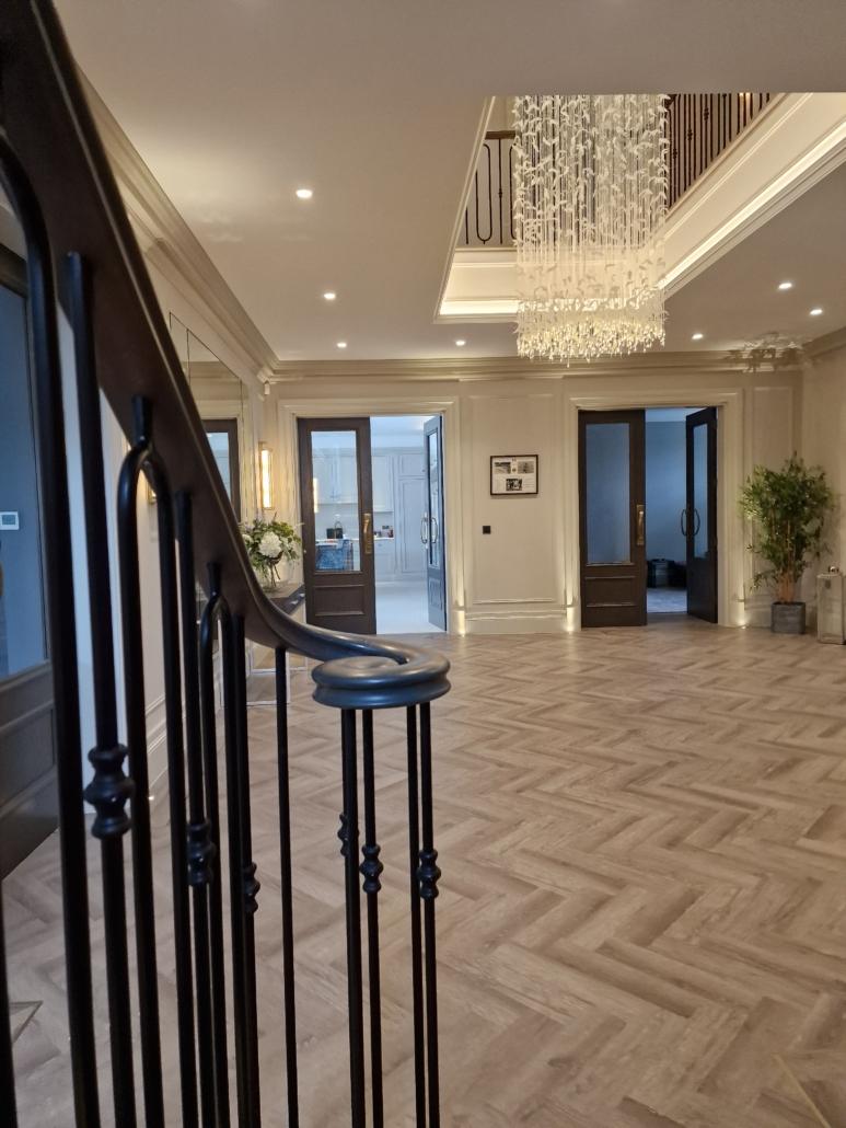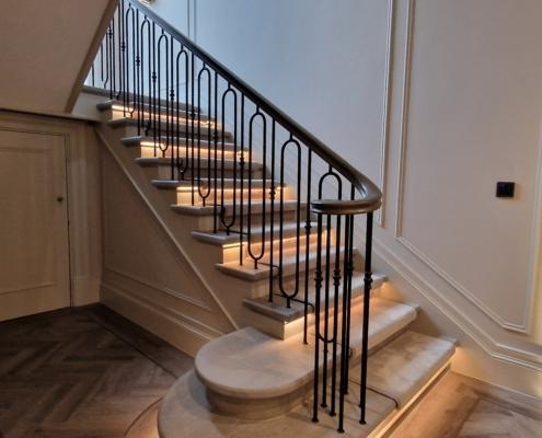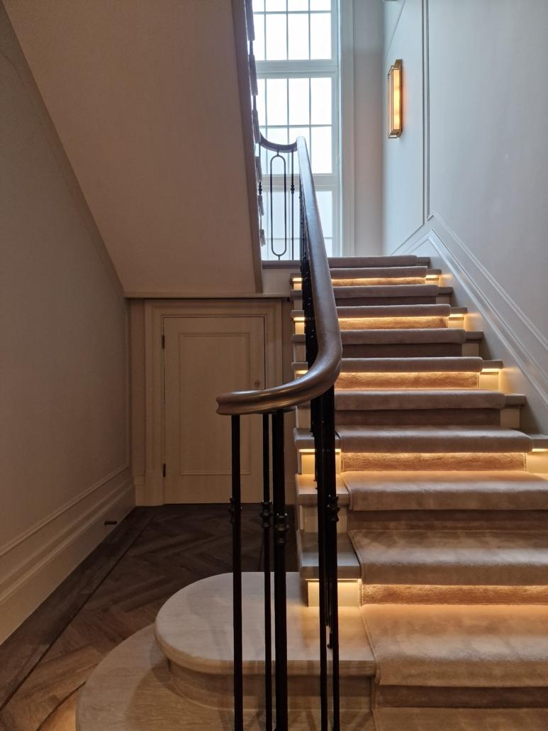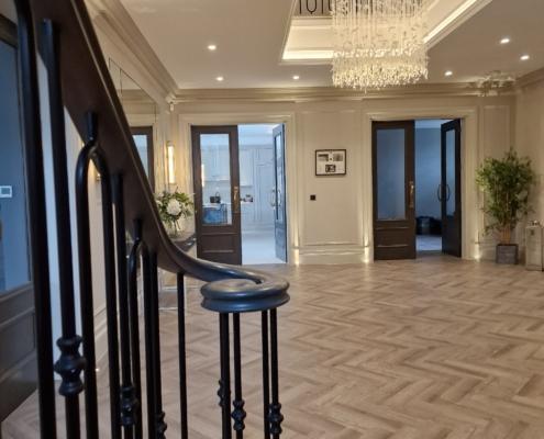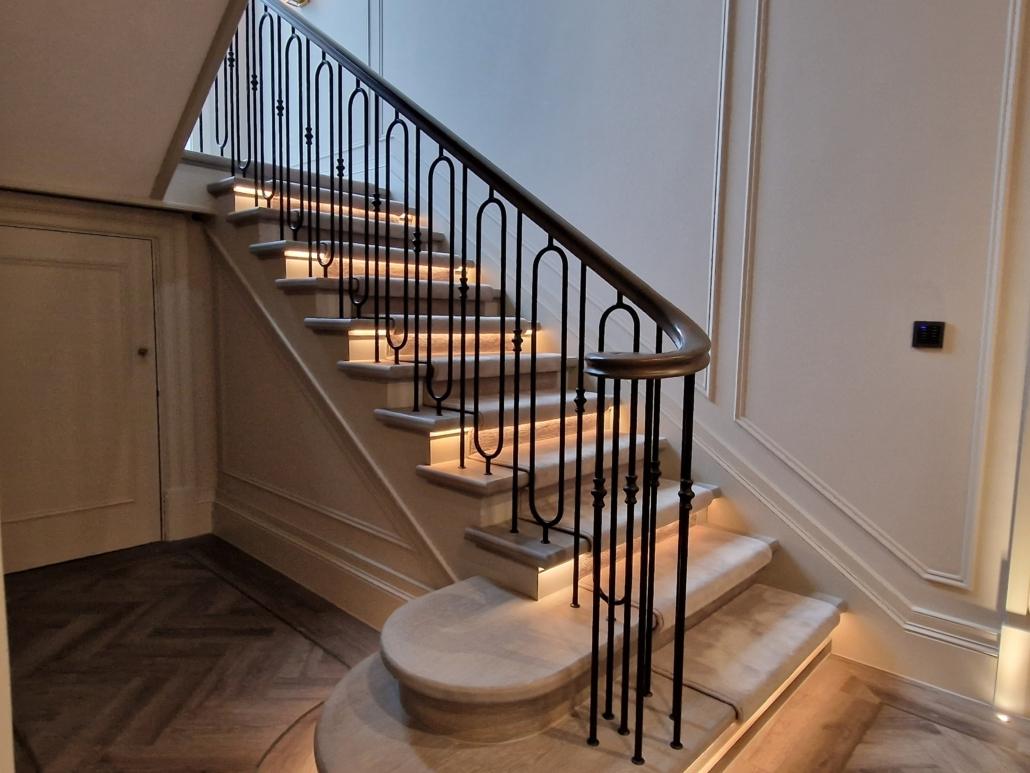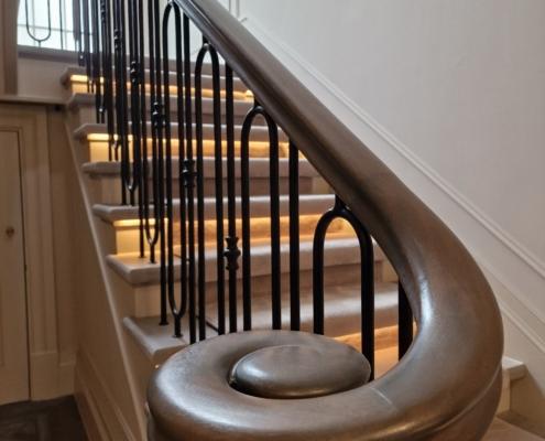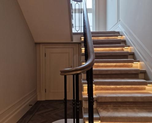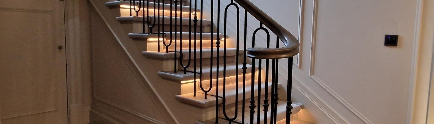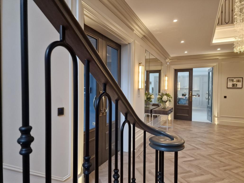 Our bespoke ‘hooped’ spindles – each adorned with hand‑fitted decorative collars – were meticulously hand‑sprayed in‑house to ensure a flawless finish and cohesive look across the entire installation. To complement these spindles, we crafted continuous handrails in sapele, expertly French‑polished to a mirror sheen – the tone and grain bringing warmth and elegance to the overall space.