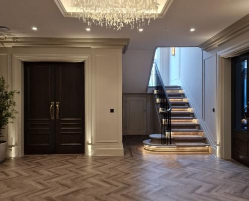 For a private residence in Surrey, we were commissioned to design, manufacture and install four flights of stairs and one large gallery. The cast-concrete stairs were to be enhanced with timber cladding and a full balustrade and handrail carefully crafted by our team. Working to our usual high standards, the stairs themselves were finished by others, but we took responsibility for the timber overlay and the complete balustrade, tying the staircases together seamlessly with the gallery level above.