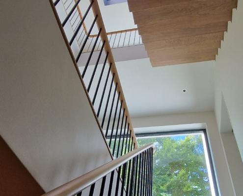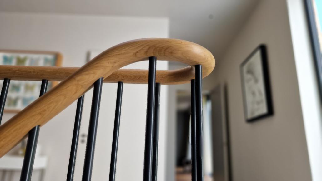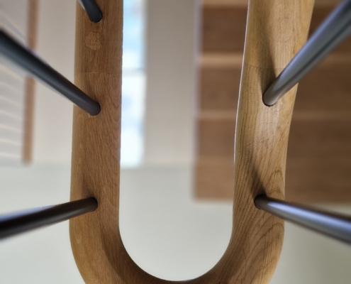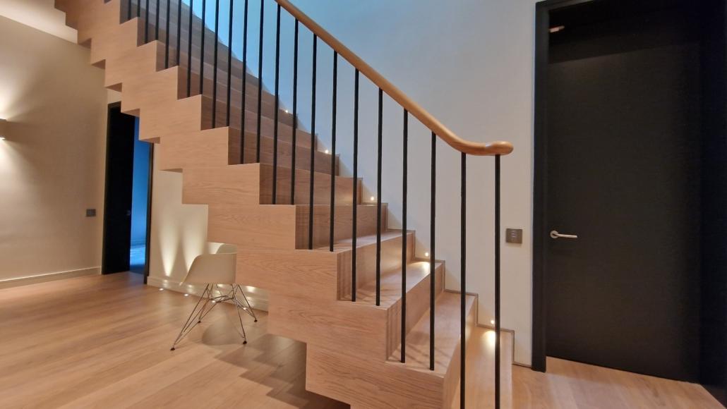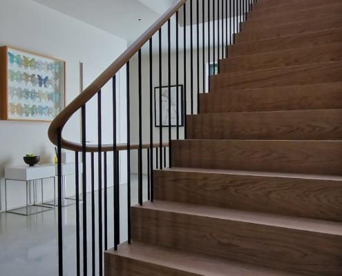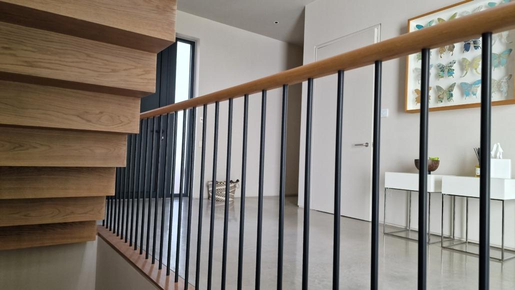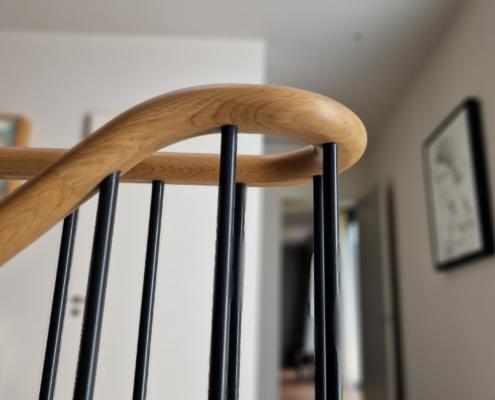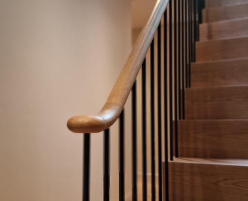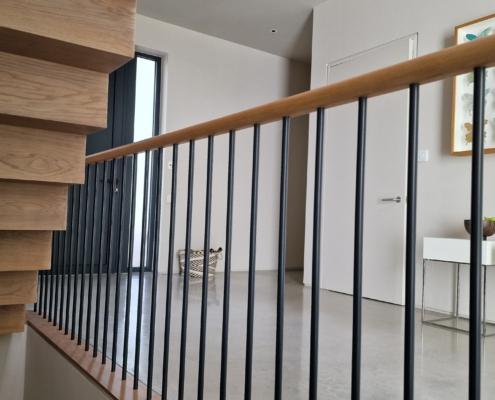 For this project we used 16mm round steel bars, powder‑coated in‑house for a flawless, durable finish, paired with continuous oak handrails finished naturally to highlight the timber’s natural warmth and grain.
