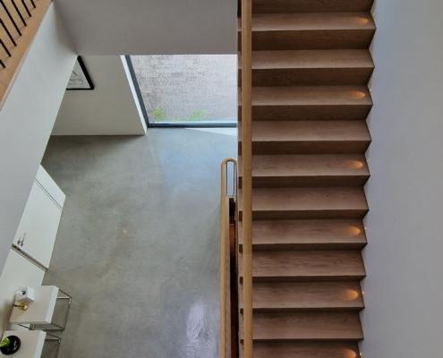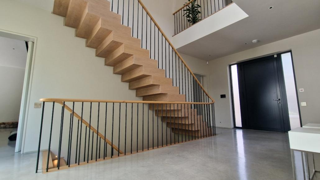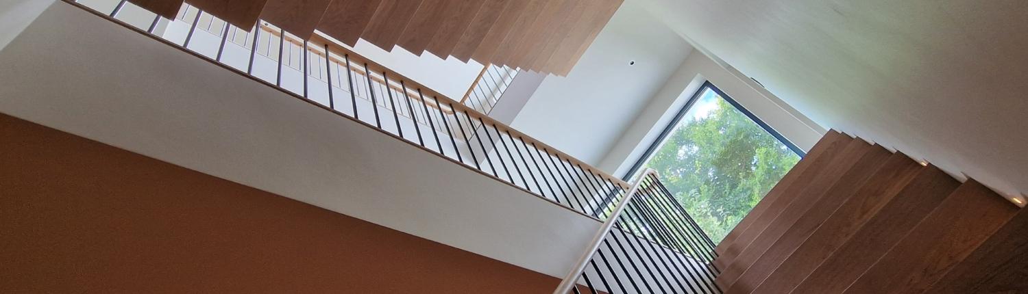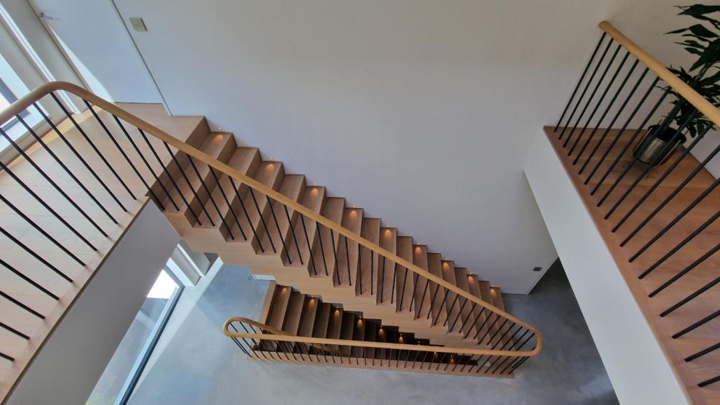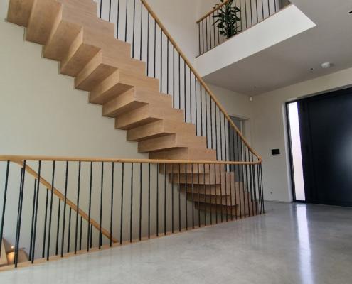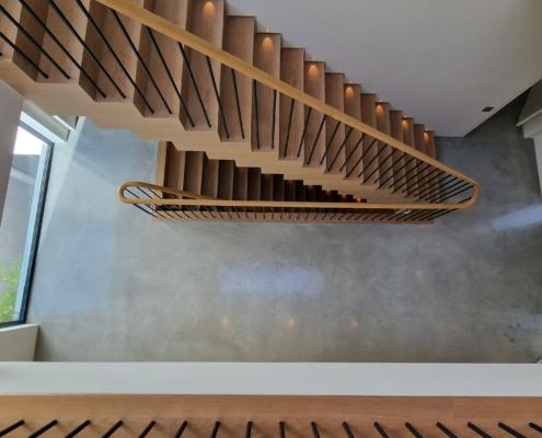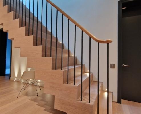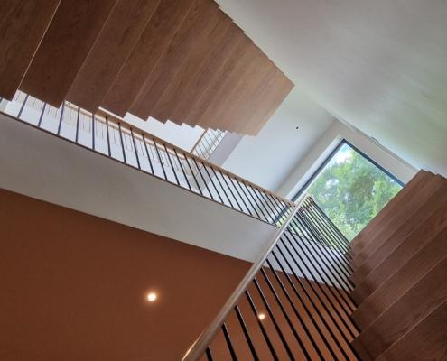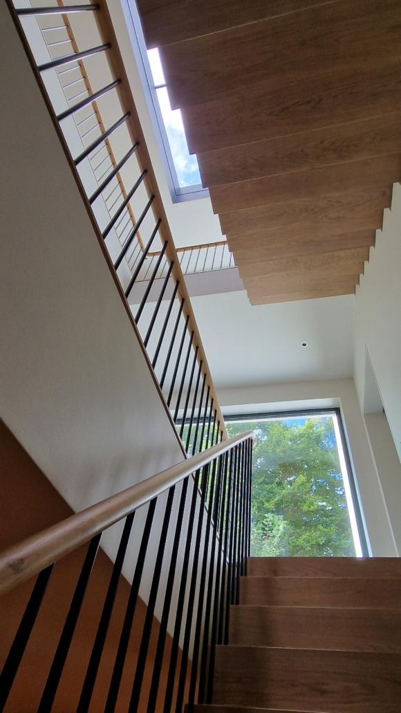For this project we used 16mm round steel bars, powder‑coated in‑house for a flawless, durable finish, paired with continuous oak handrails finished naturally to highlight the timber’s natural warmth and grain.